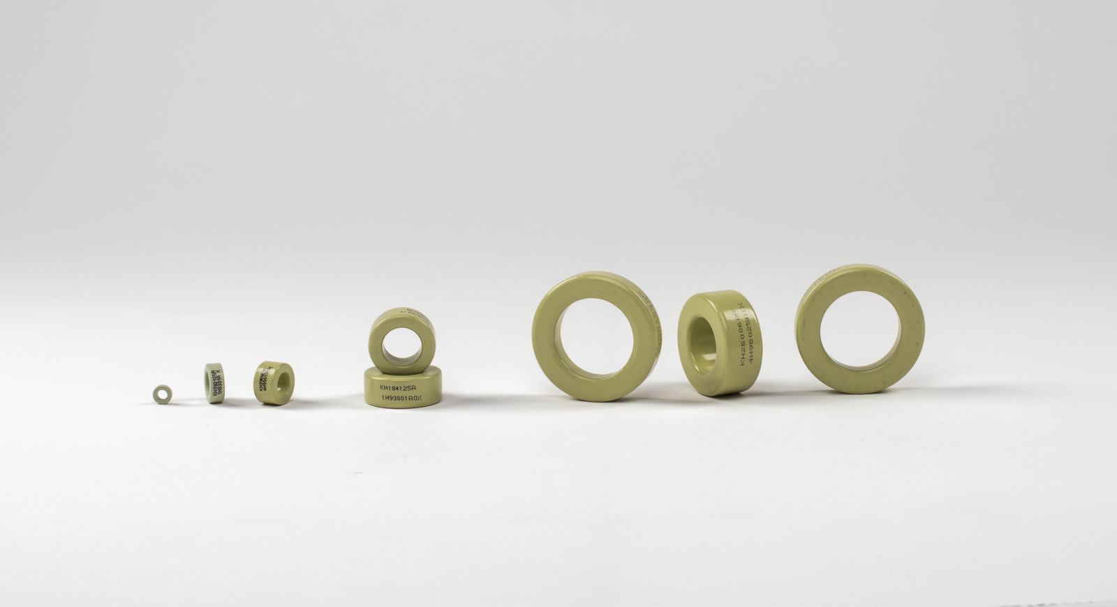 鐵鎳磁粉芯(KH)是由50%Fe和50%Ni的合金粉末制成的金屬粉末磁芯,也稱高磁通磁粉芯,在所有的粉末材料中,鐵鎳磁粉芯具有較好的DC偏置能力,高飽和磁通密度(15000高斯)和低磁芯損耗高儲(chǔ)能特性,非常適用于大功率、大直流偏置的應(yīng)用,如調(diào)光電感器,回掃變壓器、在線噪音濾波器、脈沖變壓器和功率回?cái)?shù)校正電感器等。